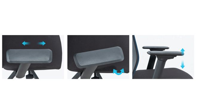 Подлокотники с чехлом из полиуретана, мягкие и удобные, можно регулировать вверх и вниз/вперед/поворот, подлокотник по всему периметру.