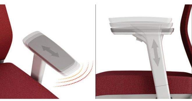 Подлокотники регулируются по высоте в соответствии с предпочтениями пользователя и имеют дополнительную регулировку вперед/назад и наклона.