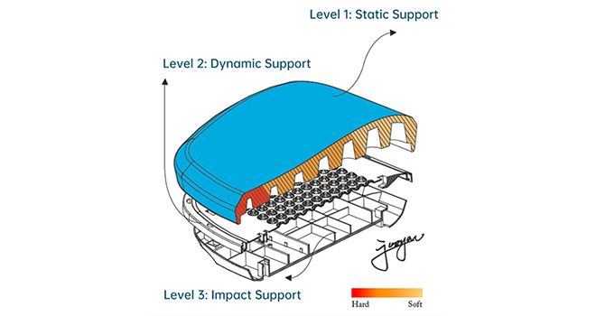 Уровень 1: Распределение размеров конических отверстий обеспечивает различную жесткость поддержки в положении сидя. Уровень 2: Опорная точка обеспечивает другой буфер в ситуации поворота. Уровень 3: Зазор между пространством обеспечивает мягкую поддержку при динамических ударах.